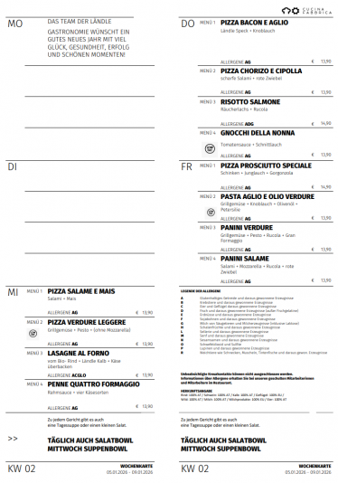 Wir legen großen Wert darauf, dass unser Angebot vielfältig und den Saisonen angepasst ist. Aus diesem Grund gibt es jede Woche eine neue Mittagskarte, und alle drei Wochen eine neue Abendkarte. Unser Lasagne-Mittwoch ist mittlerweile zu einer Tradition geworden, die von unseren Gästen sehr geschätzt wird. In der Cucina Fabbrica wird leidenschaftlich gerne gekocht, und das schmeckt man.