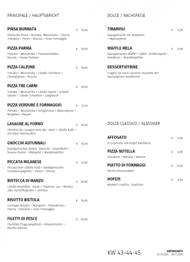 Wir legen großen Wert darauf, dass unser Angebot vielfältig und den Saisonen angepasst ist. Aus diesem Grund gibt es jede Woche eine neue Mittagskarte, und alle drei Wochen eine neue Abendkarte. Unser Lasagne-Mittwoch ist mittlerweile zu einer Tradition geworden, die von unseren Gästen sehr geschätzt wird. In der Cucina Fabbrica wird leidenschaftlich gerne gekocht, und das schmeckt man.