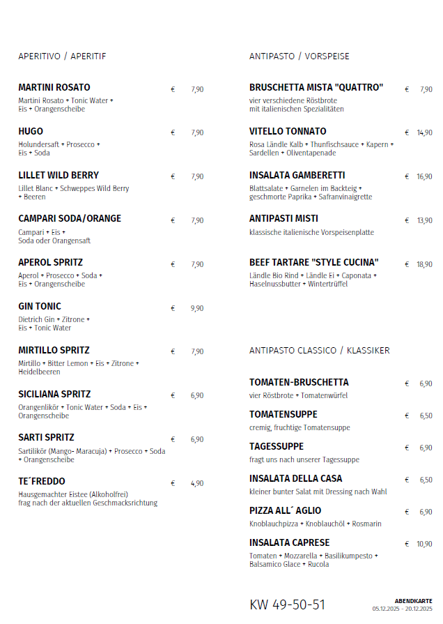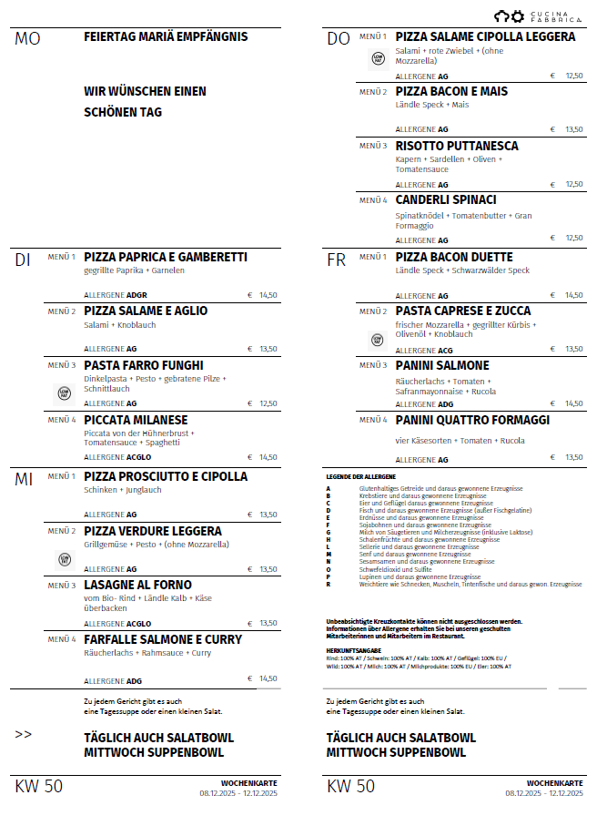 Wir legen großen Wert darauf, dass unser Angebot vielfältig und den Saisonen angepasst ist. Aus diesem Grund gibt es jede Woche eine neue Mittagskarte, und alle drei Wochen eine neue Abendkarte. Unser Lasagne-Mittwoch ist mittlerweile zu einer Tradition geworden, die von unseren Gästen sehr geschätzt wird. In der Cucina Fabbrica wird leidenschaftlich gerne gekocht, und das schmeckt man.